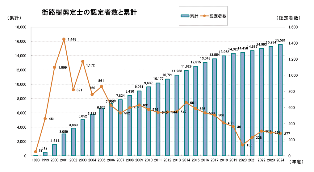 街路樹剪定という技能を伴う技術分野においては、資格取得後も技能の維持、向上に努めることは当然であり、更新による資格認定はきわめて大切なことです。