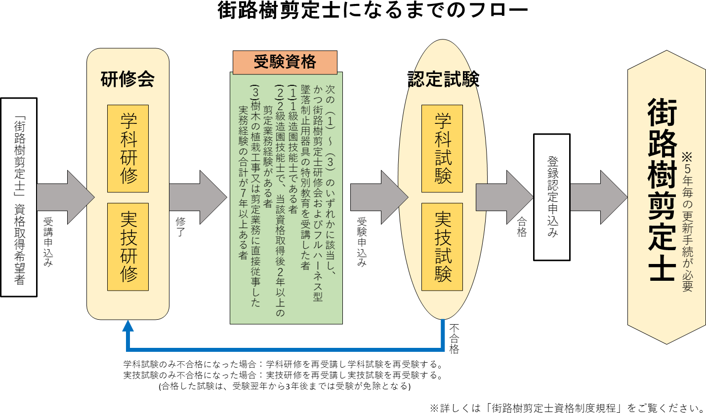 街路樹をとりまく最近の状況や、認定資格制度の透明性、公平性、厳格化が求められる状況に対応して、「街路樹剪定士」の技術力と資格の位置づけを高めるため、5年ごとに資格更新を実施しています。