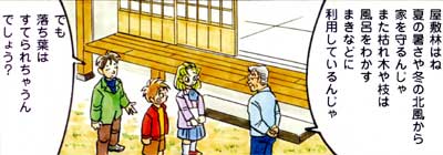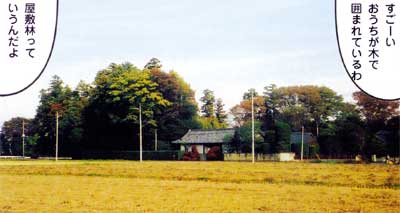 ●屋敷林のあるくらし● 冬の季節風が強い地域では、農家などの屋敷の周りに木を植えて北風などから家を守ってきました。これを屋敷林といいます。屋敷林は、北風や夏の強い日差しを防ぐほか、その枝や落ち葉が燃料や肥料として、くらしに使われてきました。