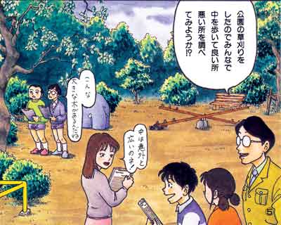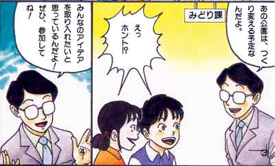 公園を新しくするときは、市や町などの公園の専門家と住民(子供からお年寄りまで)が集まり、アイデアを出しあってみんなで考えます。計画をまとめ、設計図面を書く人をランドスケープアーキテクトといいます。