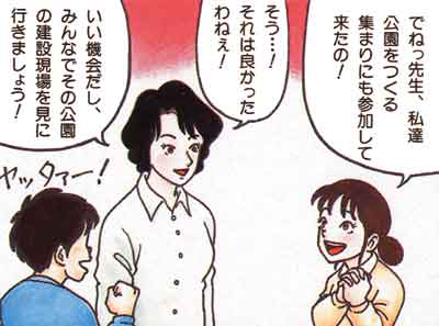 公園の建設現場では、色々な人が働いています。地下に配水管を通したり、大きな木を運んで来て植えたり、遊具やベンチを据え付けます。切った木の枝もリサイクルされているのですね。