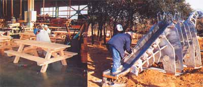 公園の遊具やベンチは専門メーカーの工場でつくられ、公園で組み立てられます。美しく、使いやすく、しかも安全であることが求められます。