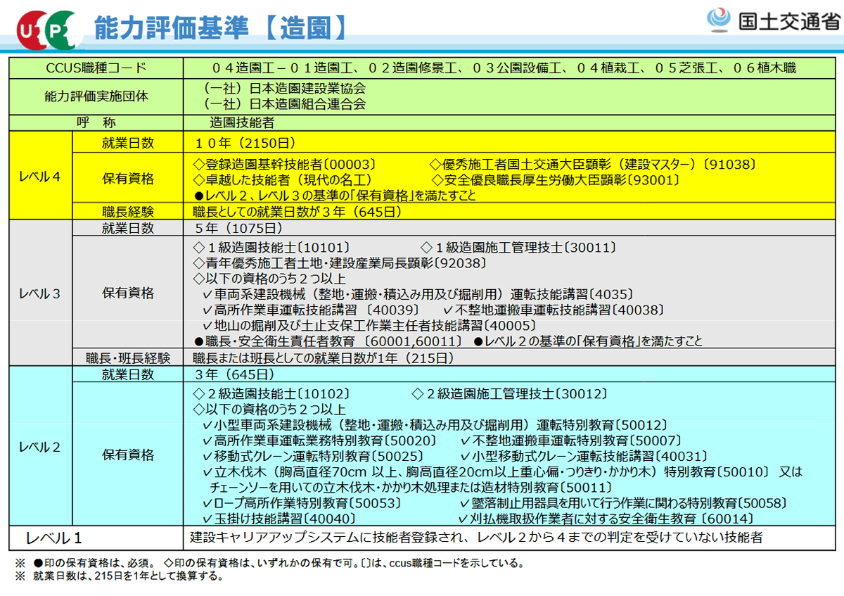 例)レベル3の1級造園技能士を保有していれば、レベル2の2級造園技能士も保有しているものとして取り扱う