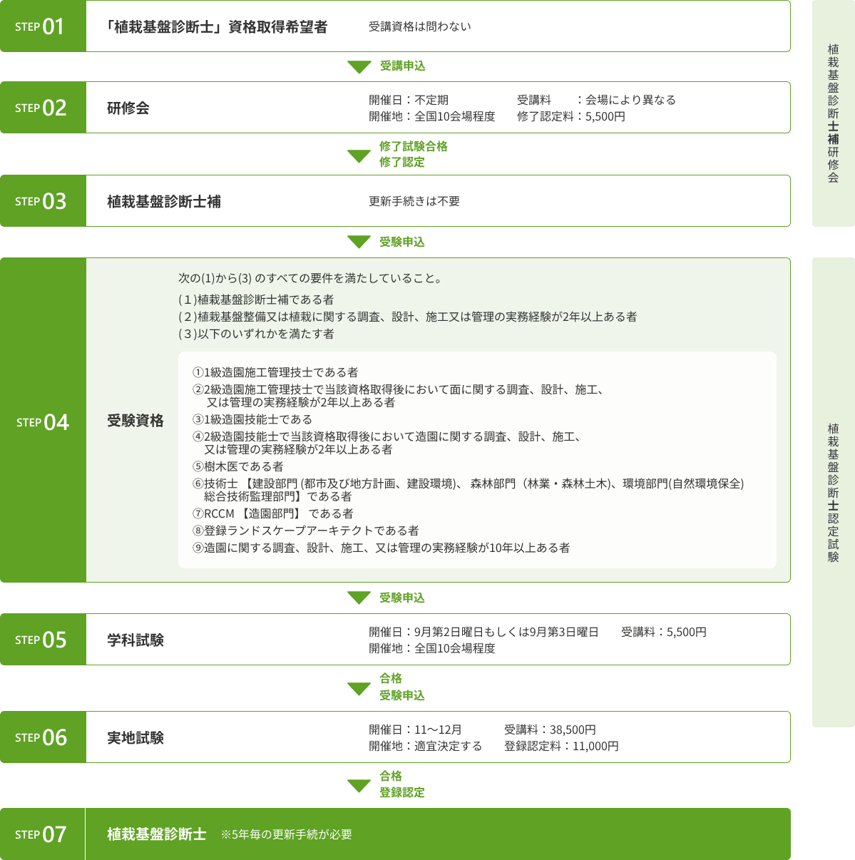 受講資格 | 以下の(1)~(3)のすべての要件を満たすこと。 (1)植栽基盤診断士補である者 (2)植栽基盤整備又は植栽に関する調査、設計、施工又は管理の実務経験が2年以上ある者 (3)以下のいずれかを満たす者